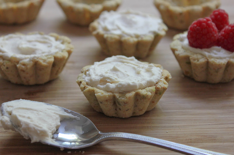 After baking and eating these adorable tarts, I can definitely say that they have been added to the list of our favorite desserts. The pistachio shells are delicately crisp and the mascarapone filling is to die for! I have to admit that while assembling them, more filling went directly into my mouth than into the tarts. :)