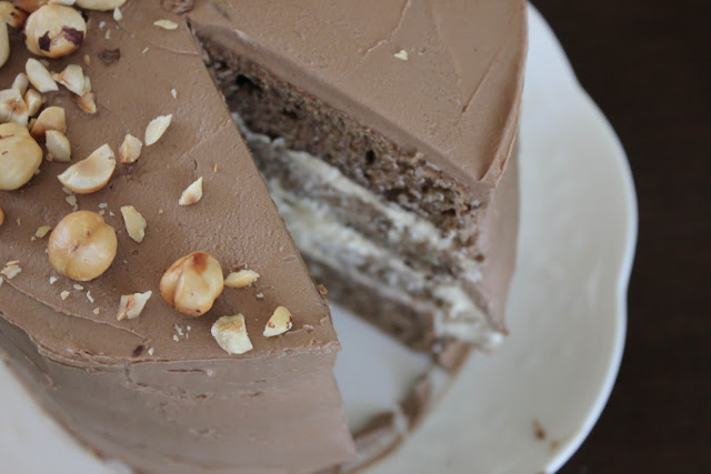 I had been craving chocolate cake for a couple weeks and this past weekend when I was looking for something to make I knew it had to be cake. I love the combination of chocolate and hazelnuts, but I wasn't able to find a recipe that included both, so I had to improvise. I used this recipe for the cake part and added toasted hazelnuts into the batter. Then, I made a hazelnut buttercream by using this recipe for the buttercream and added hazelnut praline to it. I made the hazelnut praline by combining toasted hazelnuts and sugar in a food processor for about 3-5 minutes, until it was creamy. To assemble the cake I spread each layer with the hazelnut buttercream and a thin layer of nutella. The result was delicious!